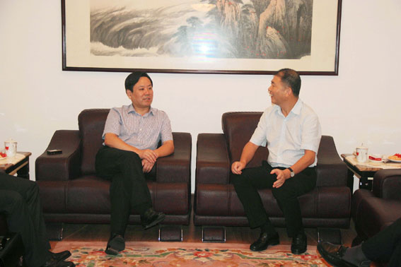 區政協主席譚勤奮(左一)與我集團董事長李成新(右一)在集團接待室作深入交談。