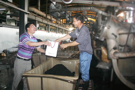 7月28日下午,黨灣鎮黨委書記周勝華(圖左)、鎮黨委副書記陳偉忠等在集團副總經理馮永先、杭州三印染整有限公司總經理張紹基的帶領下來到三印公司車間,對炎炎夏日堅守在工作崗位上的職工進行親切慰問,送上礦泉水、毛巾、洗滌用品等防暑降溫慰問品。叮囑職工們增強防暑意識,注意自己的身體,防止中暑。要求企業關心職工的生產和生活,增加設施,做好車間的通風降溫工作,為職工創造良好的工作環境。